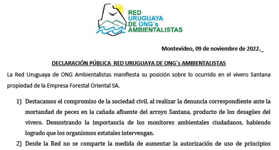 La red Uruguaya de ONGs Ambientalistas emitió una declaración en la cual marcan posición respecto a agroquímicos manifestando además la constante búsqueda de un Uruguay sustentable y sostenible.
