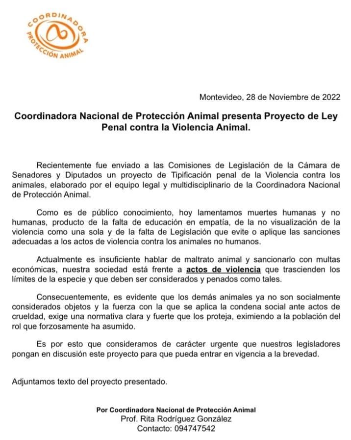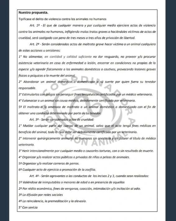 La Coordinadora Nacional de Protección Animal envió a las comisiones del Parlamento, tanto senadores como diputados, un proyecto de Ley pensando en aplicar sanciones en el caso de violencia contra los animales.