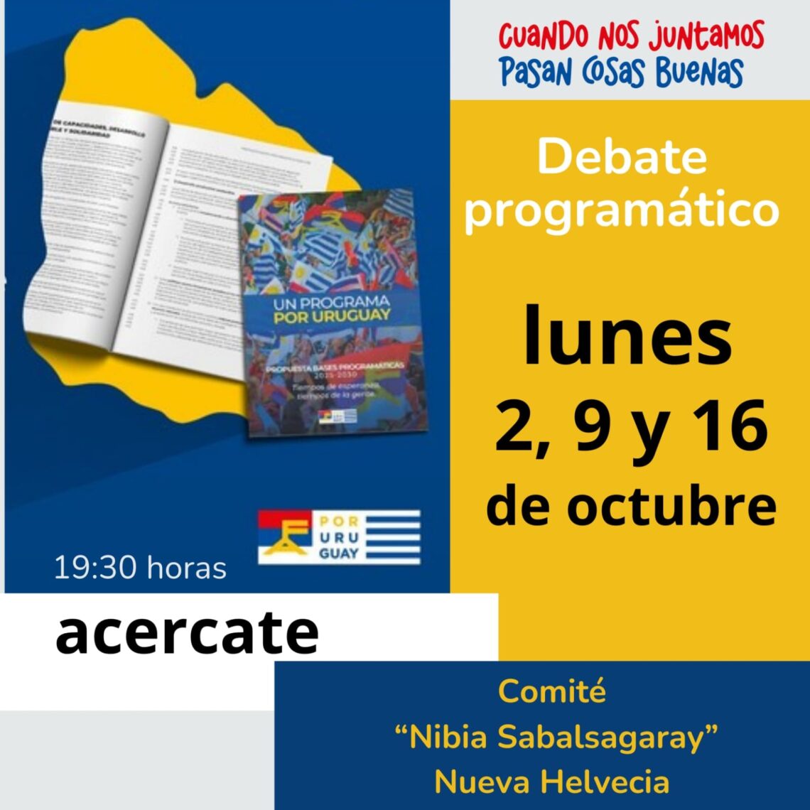 Este lunes 2 de octubre desde las 19.30 hs el comité de base Nibia Sabalsagaray de Nueva Helvecia comenzará a discutir las bases programáticas elaboradas por la fuerza política de cara el próximo periodo de Gobierno.