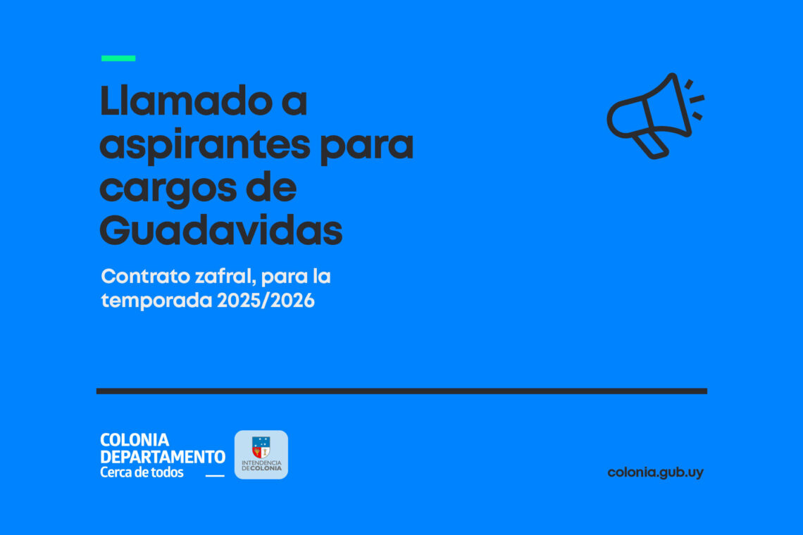 De acuerdo con la Resolución N.º 1292/2025 de fecha 20 de octubre de 2025 recaída en el Expediente EE2025/83001/10358, la Intendencia de Colonia convoca a un llamado de méritos y antecedentes, a aspirantes para cubrir: 15 (quince) cargos de Guardavidas, con funciones de contrato zafral, para la temporada 2025/2026 con destino a cubrir el Servicio de Guardavidas en las localidades de Carmelo, Artilleros, Fomento, Colonia del Sacramento, Juan Lacaze y Nueva Palmira; dependiente de la Dirección de Deportes de la Intendencia de Colonia.