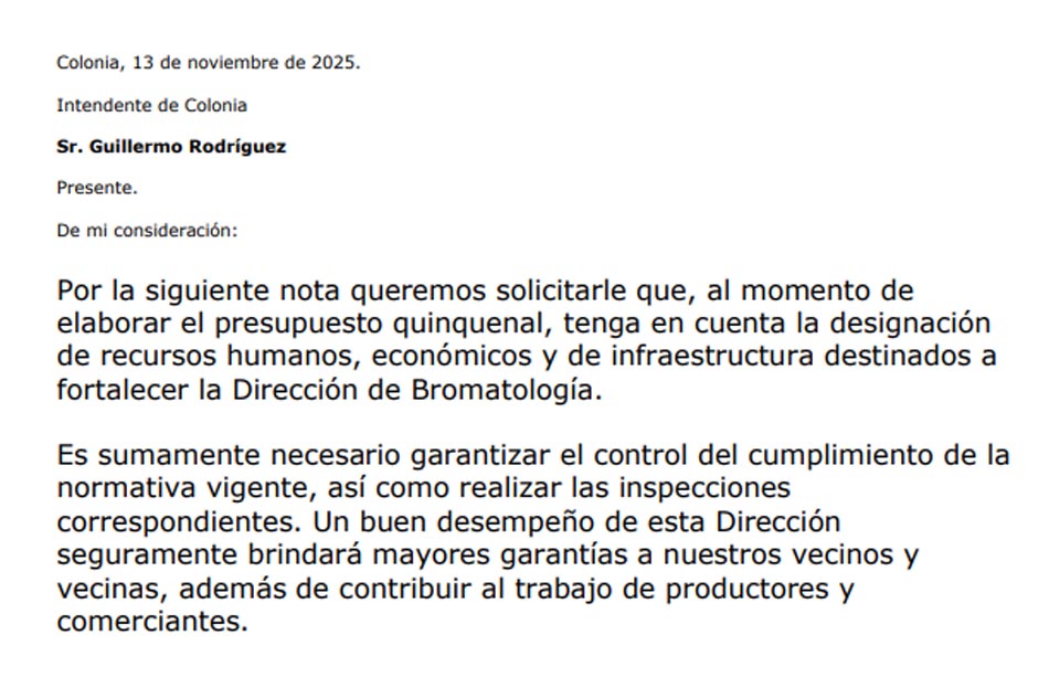 El edil departamental Carlos Fernández (FA) presentó una nota formal al intendente de Colonia, Guillermo Rodríguez, solicitando que el próximo presupuesto quinquenal incluya recursos humanos, económicos e infraestructura destinados a reforzar la Dirección de Bromatología.