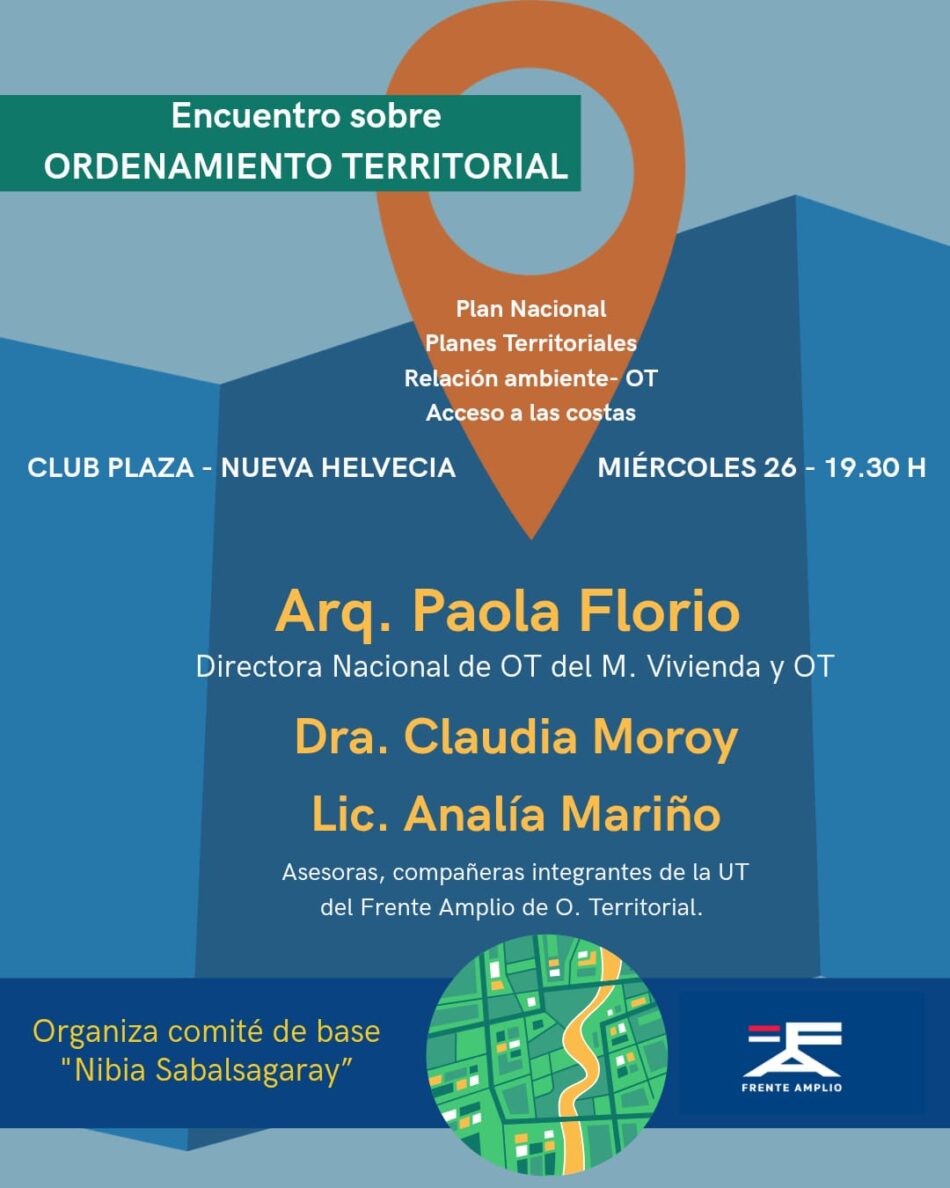 La charla será este miércoles 26 a las 19.30hs en el Club Plaza de Nueva Helvecia y contará con la presencia de la directora nacional de Ordenamiento Territorial Paola Florio.