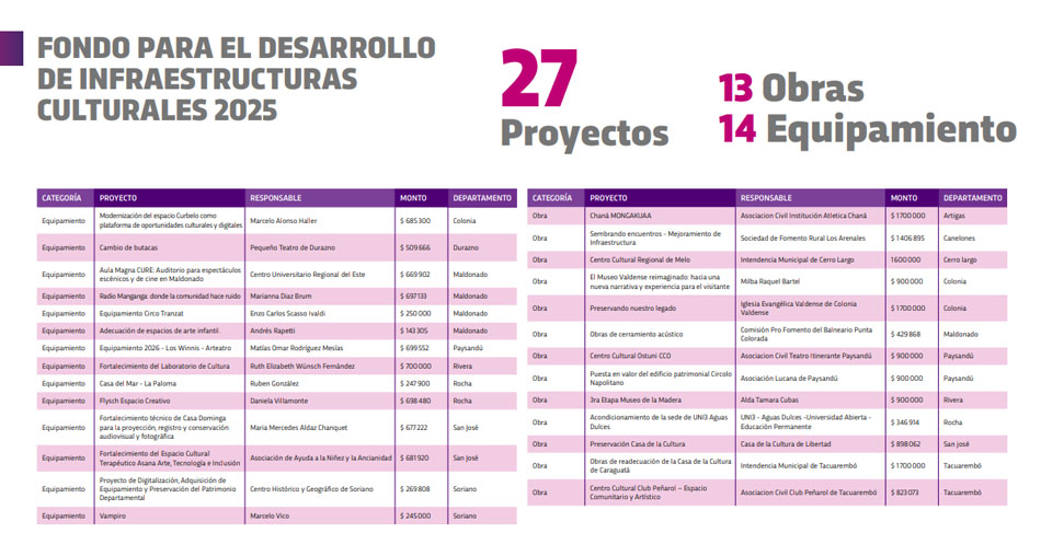 En cuanto a los fallos, se seleccionaron 150 proyectos entre los tres fondos cuyos resultados fueron anunciados. El Fondo Concursable para la Cultura apoyó 50 proyectos; el Fondo Regional para la Cultura, 73 proyectos, con especial destaque para los 20 proyectos seleccionados en la categoría Memoria y tradiciones; y el Fondo para el Desarrollo de Infraestructuras Culturales para el interior del país, 27 proyectos de obra y equipamiento en distintos puntos del territorio.