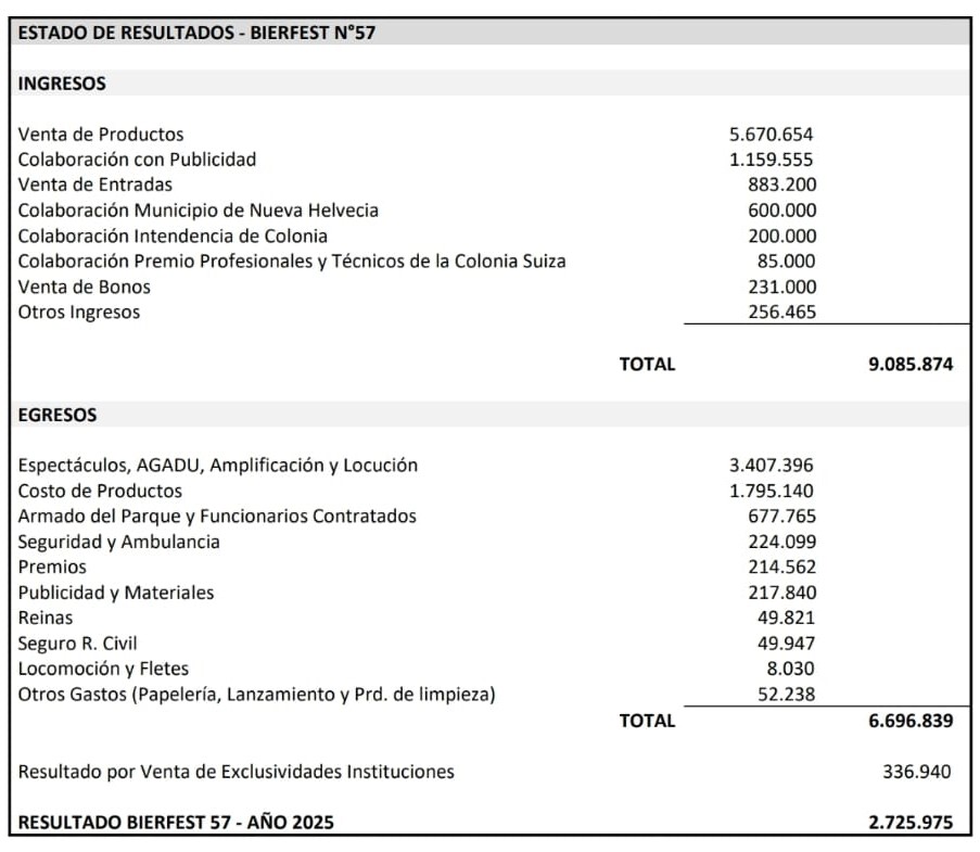 Como resultado final del ejercicio, el resultado neto de la Bierfest Nº 57 – Año 2025 fue de $ 2.725.975.