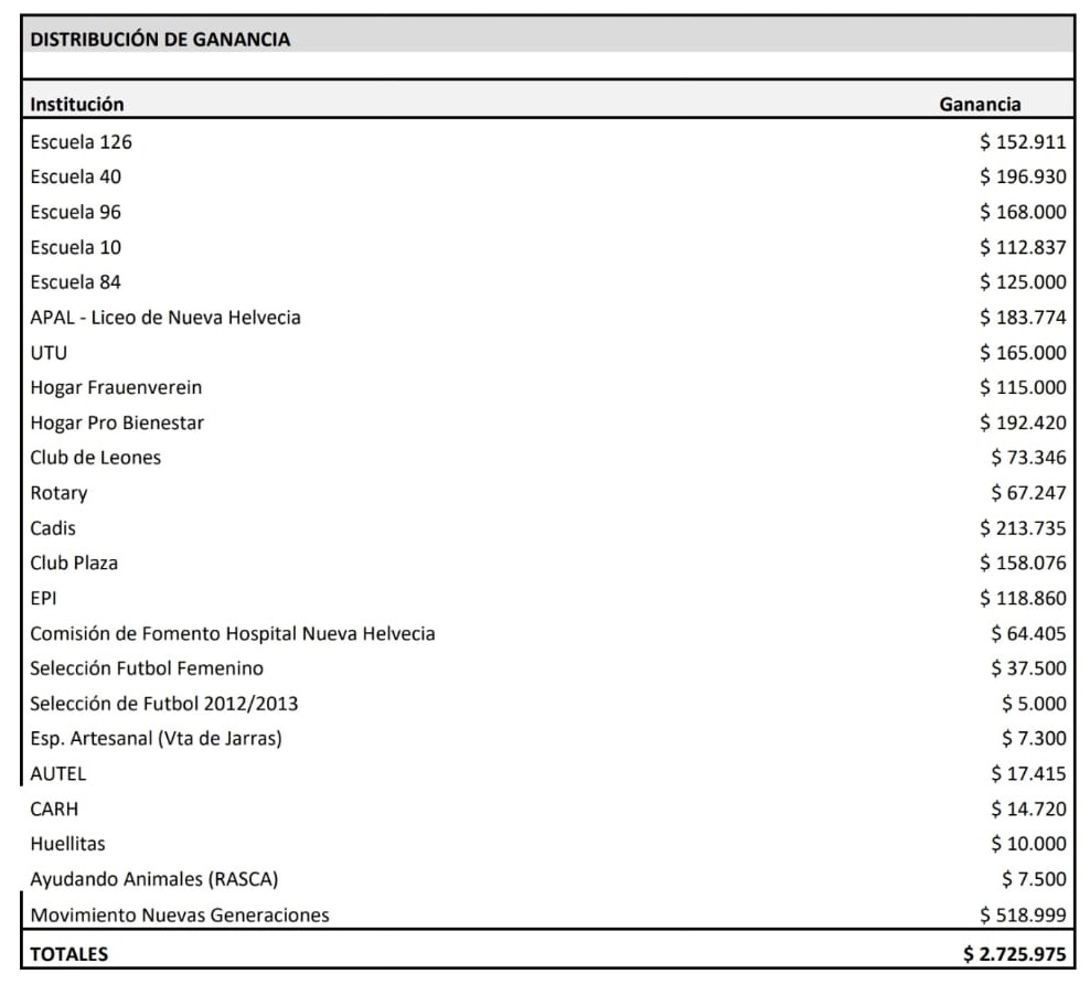 El Movimiento Nuevas Generaciones detalló además la distribución de las ganancias, que alcanzó a un total de 24 instituciones y organizaciones sociales, educativas y deportivas de Nueva Helvecia y la zona, entre ellas escuelas públicas, liceos, UTU, hogares, clubes sociales y deportivos, organizaciones solidarias y el propio Movimiento Nuevas Generaciones.