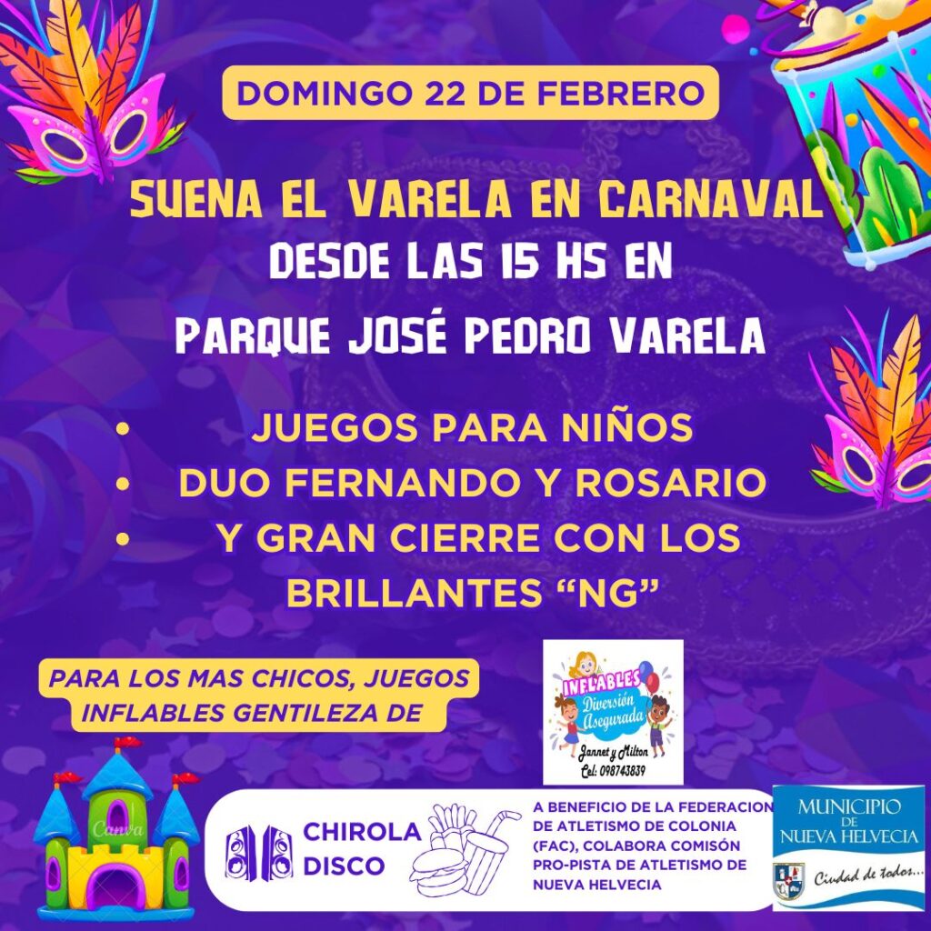 El Municipio de Nueva Helvecia informó que el próximo domingo 22 de febrero, desde las 15:00 horas, se llevará a cabo una nueva edición de “Suena el Varela” en el Parque José Pedro Varela, con una propuesta pensada para el disfrute de toda la familia.