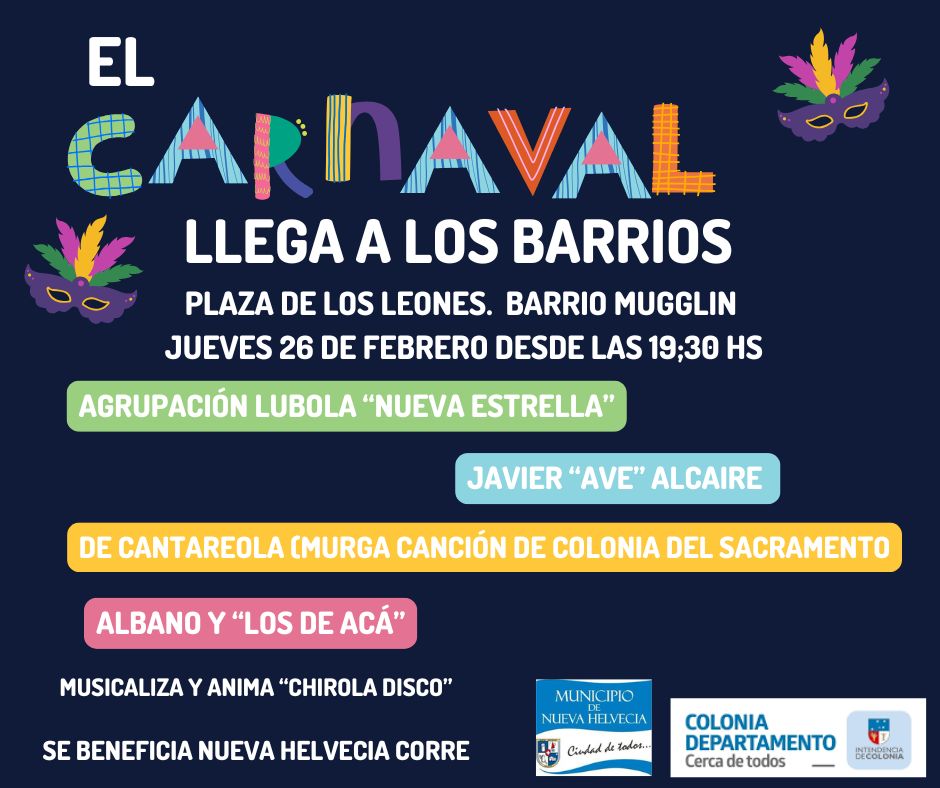 El Municipio de Nueva Helvecia invita a la comunidad a disfrutar de una nueva jornada festiva con la propuesta “El Carnaval llega a los barrios”, que se realizará el jueves 26 de febrero desde las 19:30 horas en la Plaza de los Leones, ubicada en barrio Mugglin.