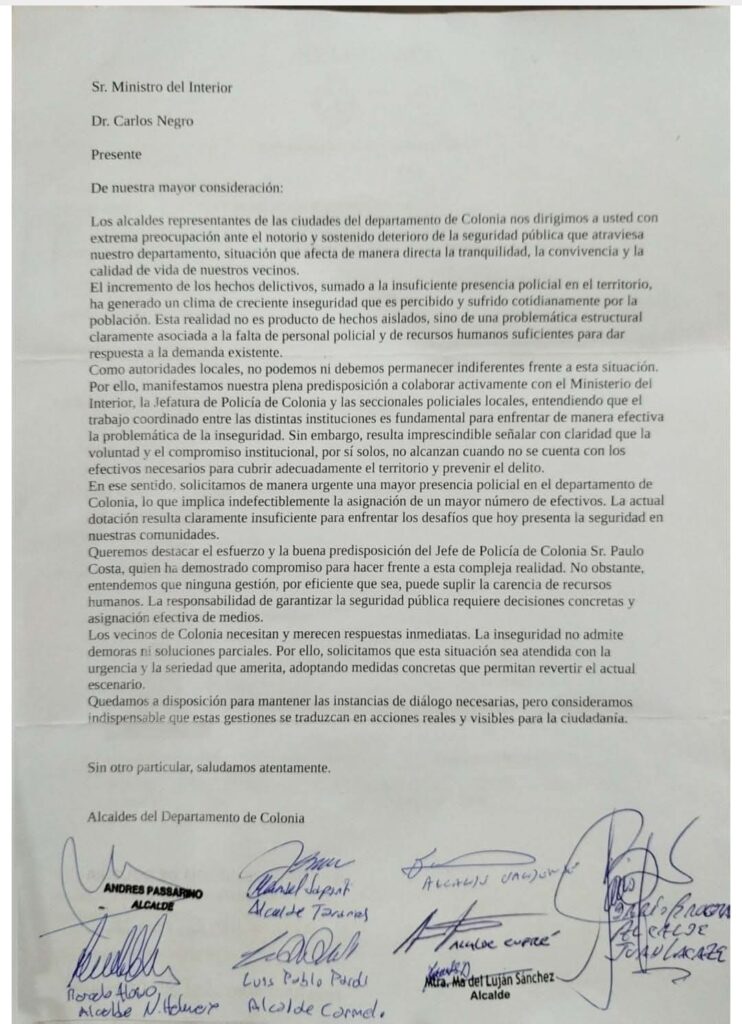 Un grupo de alcaldes del departamento de Colonia remitió una carta al ministro del Interior, Carlos Negro, en la que manifiestan su “extrema preocupación” por el deterioro de la seguridad pública y solicitan el aumento de efectivos policiales en el territorio.