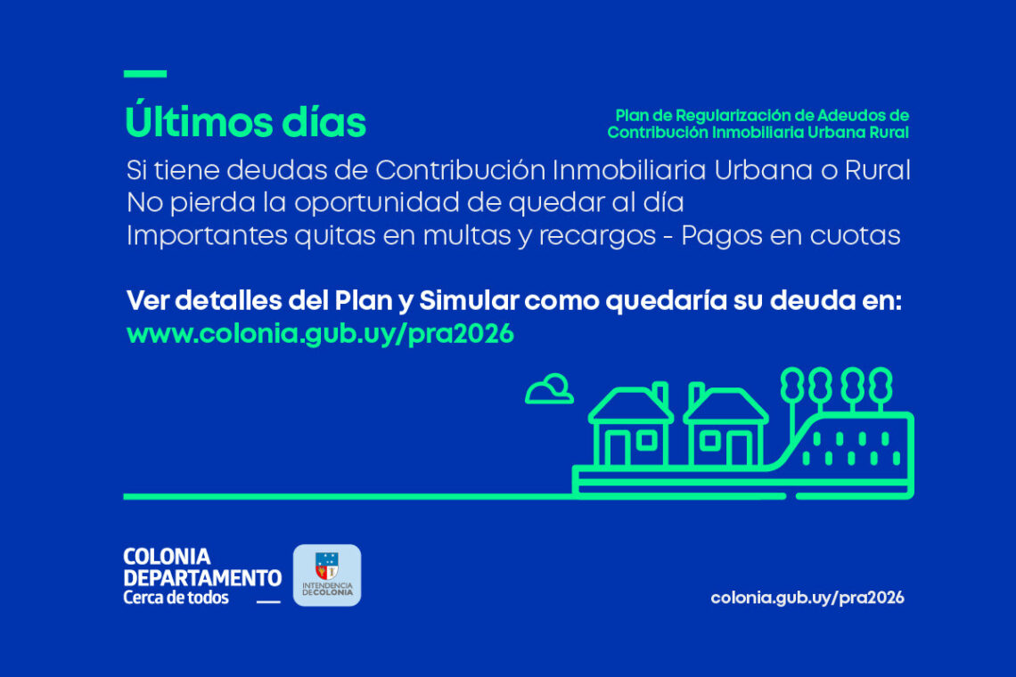 La Intendencia de Colonia informa que se encuentra vigente el Plan de Regularización de Adeudos para Contribución Urbana Suburbana y Rural. El programa ofrece descuentos significativos en multas y recargos. Quienes se pongan al día ingresarán al régimen de contribuyentes buenos pagadores a partir del próximo ejercicio. El plazo para acogerse al Plan, vence el próximo martes 7 de abril y no habrá prórroga.