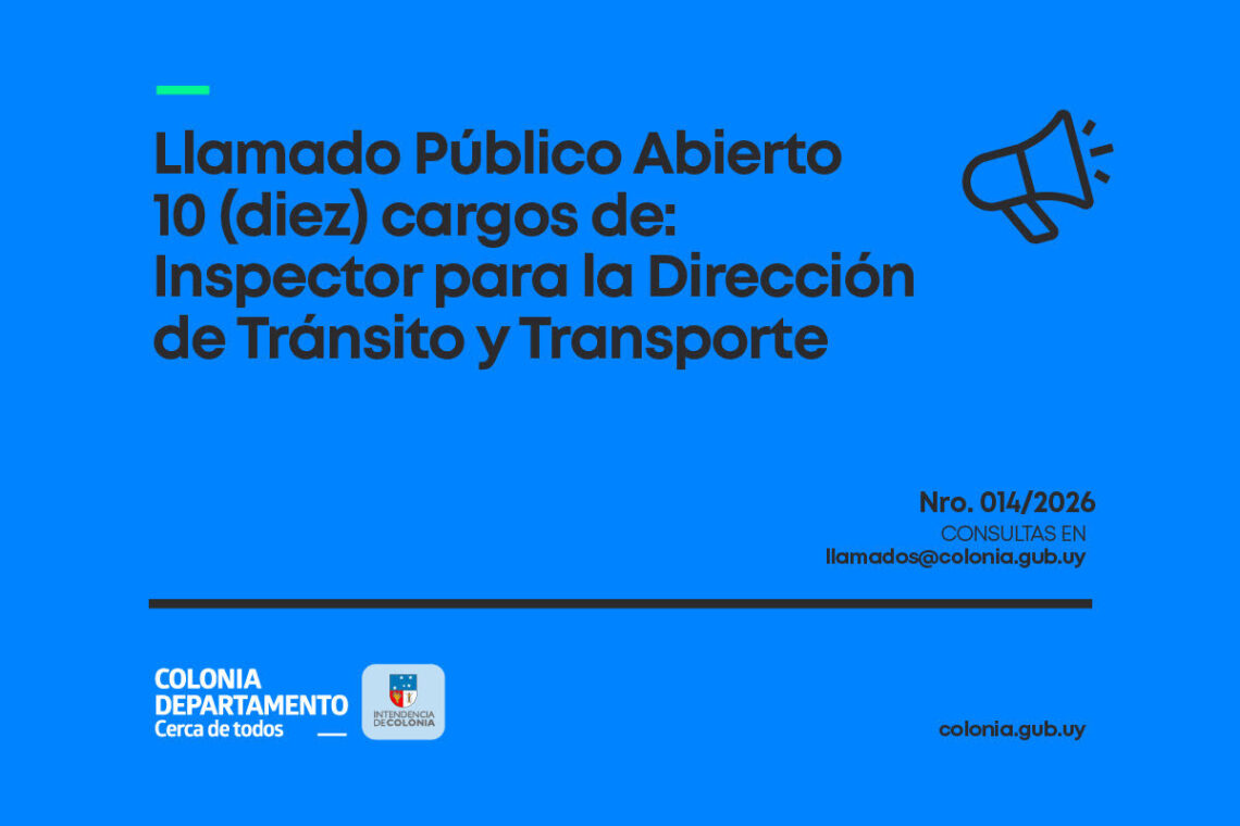 De acuerdo a la Resolución 368/026 de fecha 12 de marzo de 2026, recaída en el expediente EE2025/83001/12792, la Intendencia de Colonia, convoca a un llamado de oposición y méritos, a aspirantes para cubrir: 10 (diez) cargos de Inspector (Ad4).